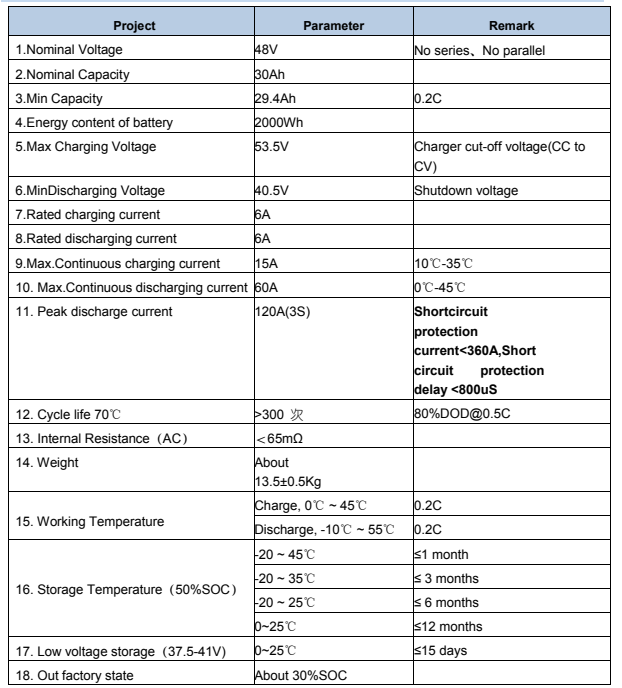 1. 30Ah 48V LIFePo4 Battery PACK Specification: